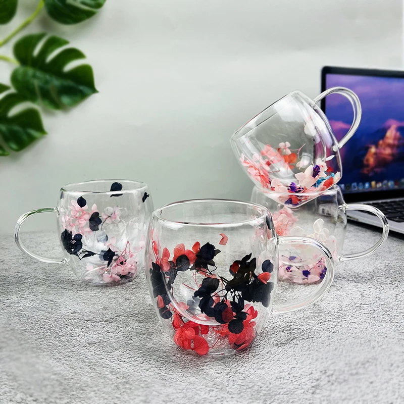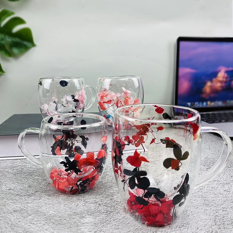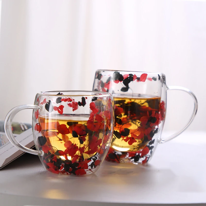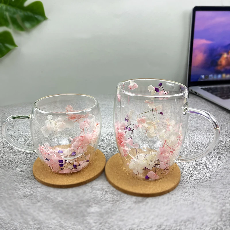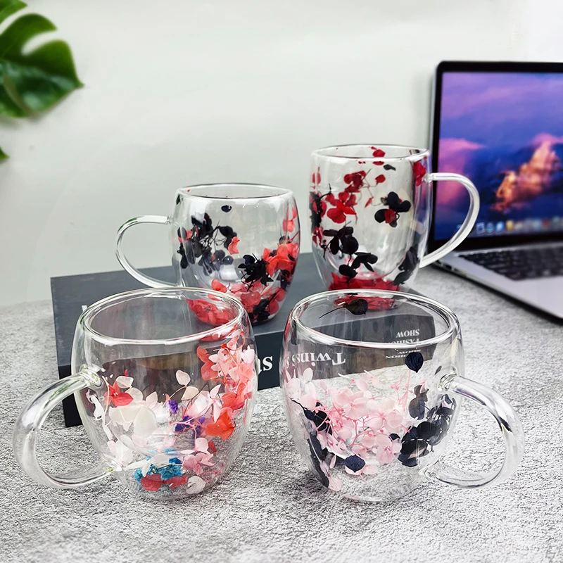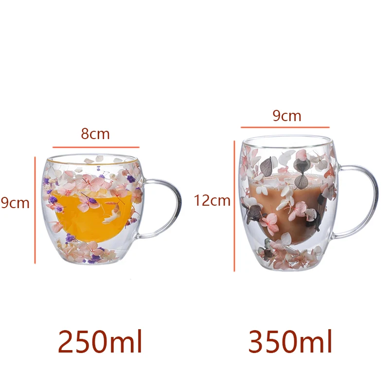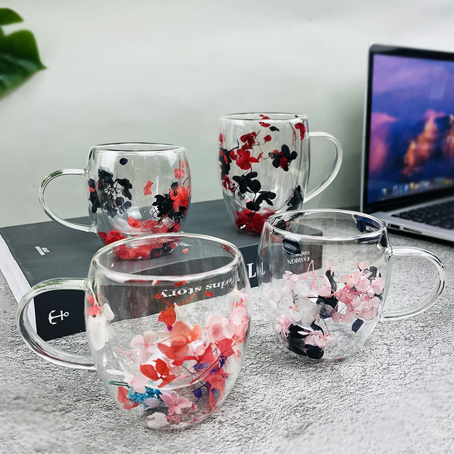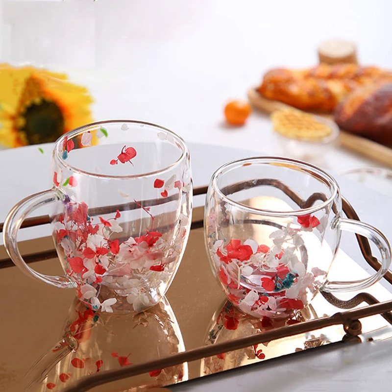 250/350ml Double Wall Coffee Mug With Handles Clear Milk Cups Gifts High Borosilicate Glass Cup Fill Simulated Flowers Teacup