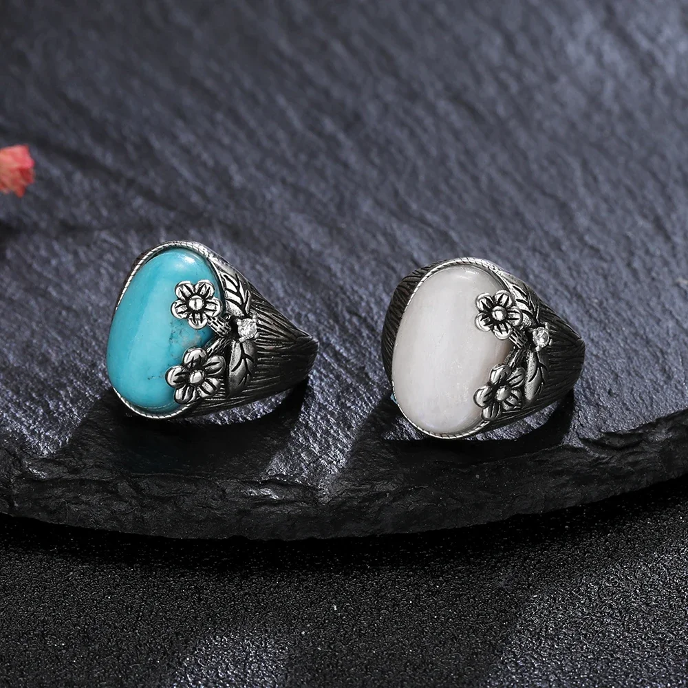 11*17MM Natural Turquoise Moonstone Ring Silver S925 Rings for Women Gift Retro Flower Fine Jewelry Wholesale