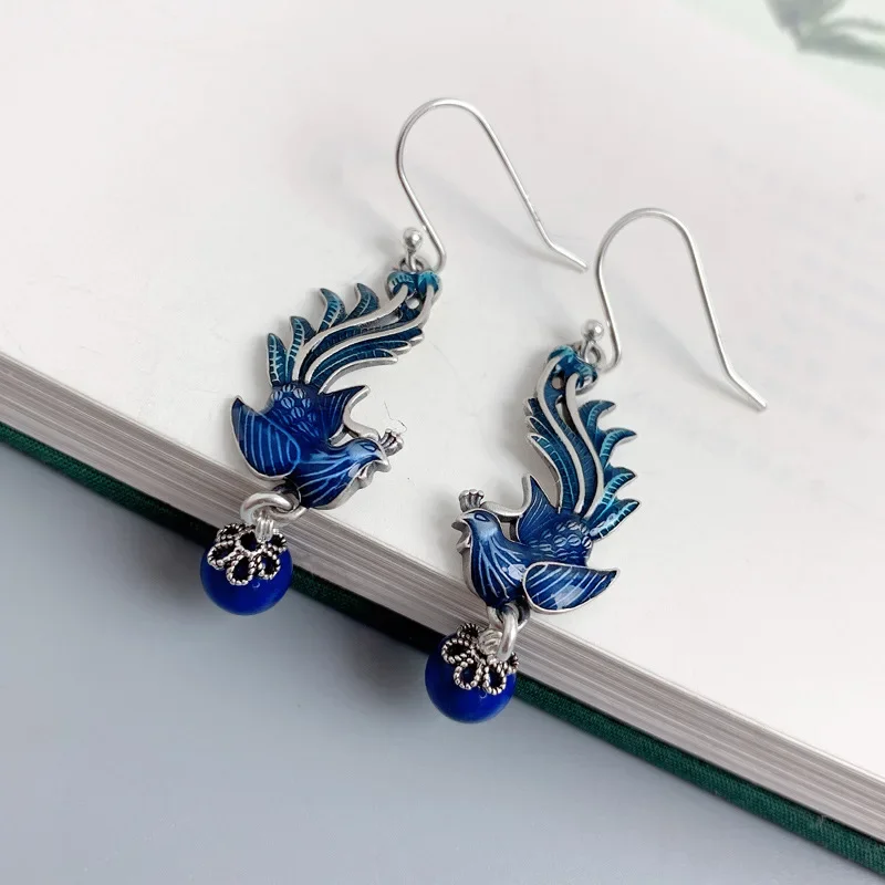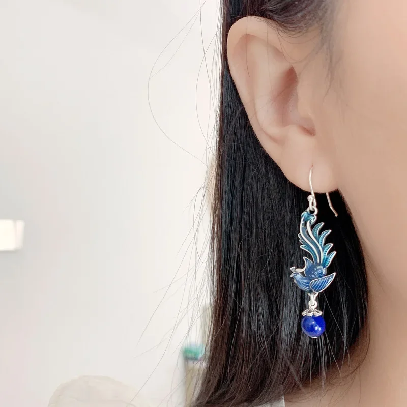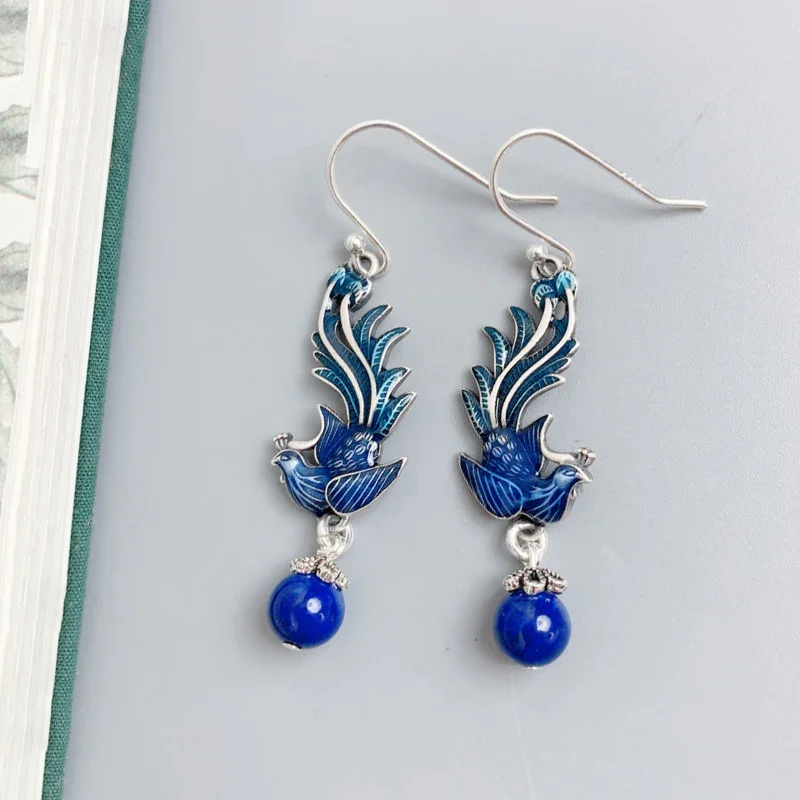 925 Silver Blue Enamel Phoenix Tassel Earrings for Women Female Chinese Style Exaggerated Lapis Lazuli Earings Banquet Jewelry