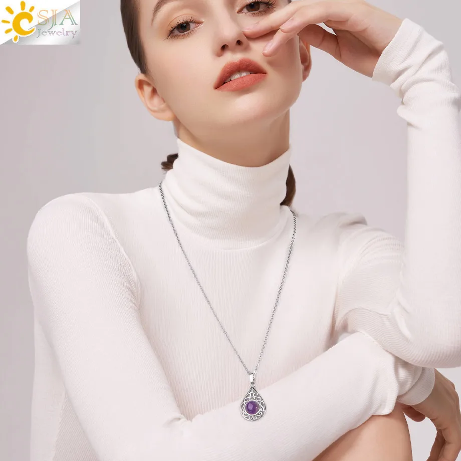 CSJA Water Drop Crystal Healing Necklace Natural Stone Pendant Cabachon Bead Energy Jewelry Amethyst Pink Quartz H557