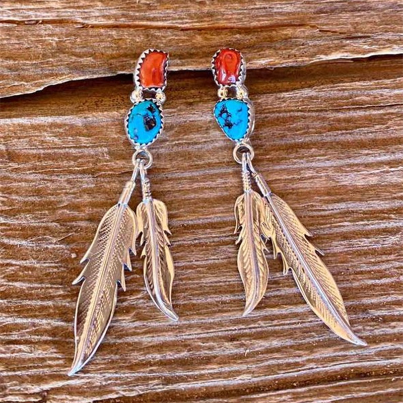 Gorgeous Unique Interesting Tibetan Silver Color Inlay Turquoise Feather Pendant Earrings
