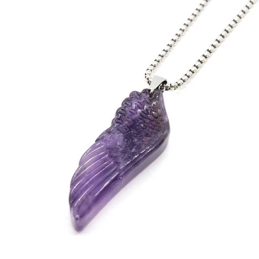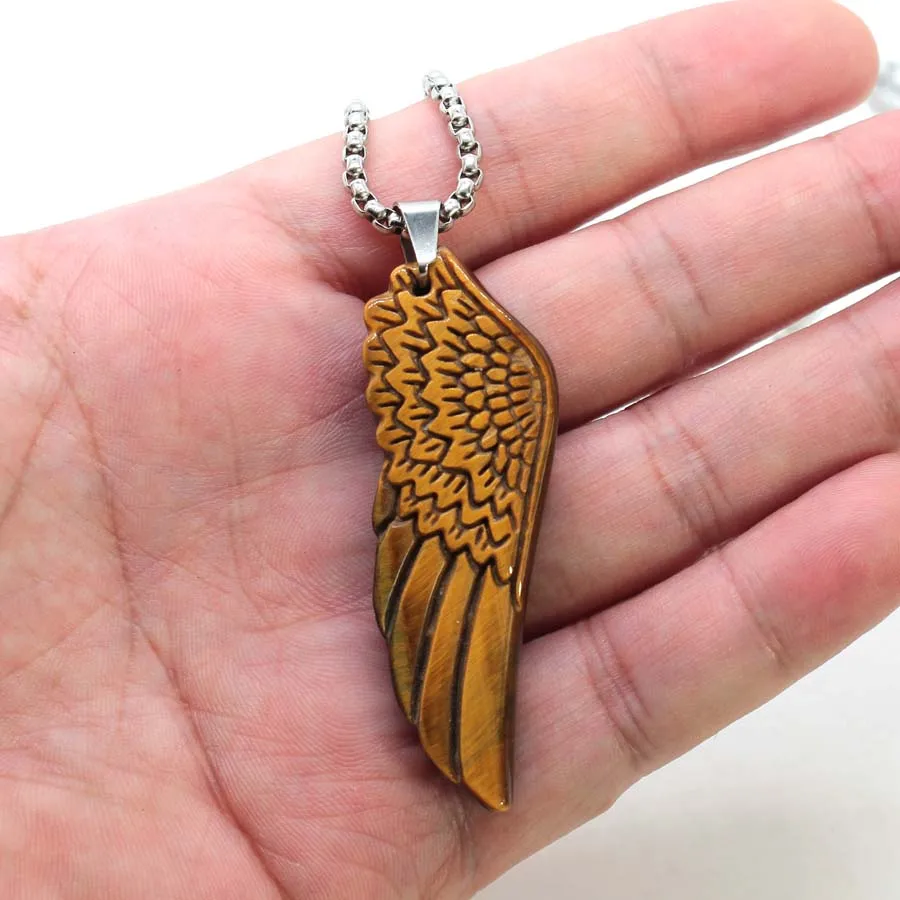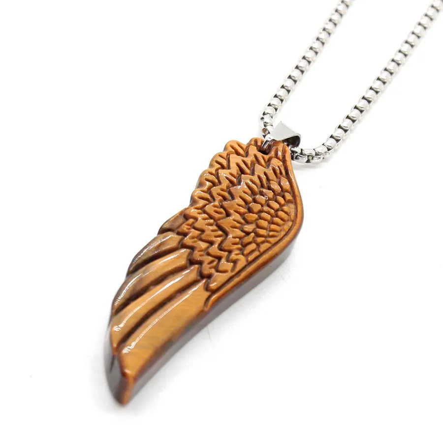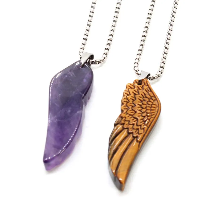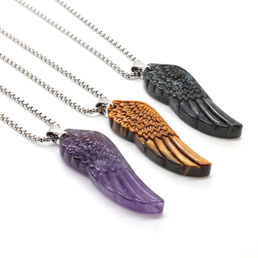 Handmade Carved Crystal Stone Angel Wings Pendant Necklace For Women Natural Amethyst Tiger Eye Stone Pendants Man Jewellery