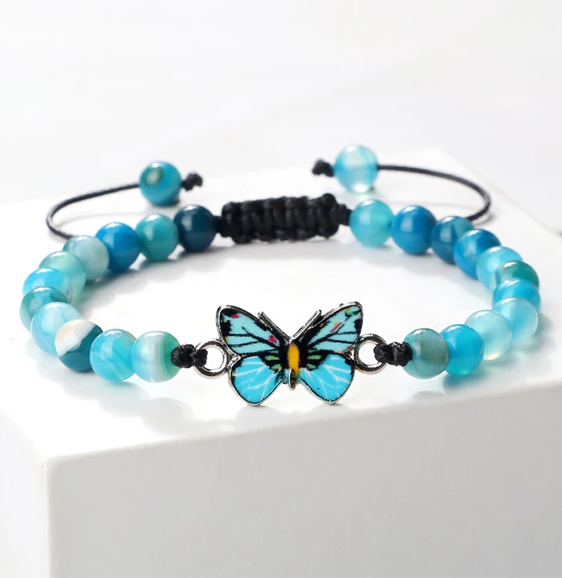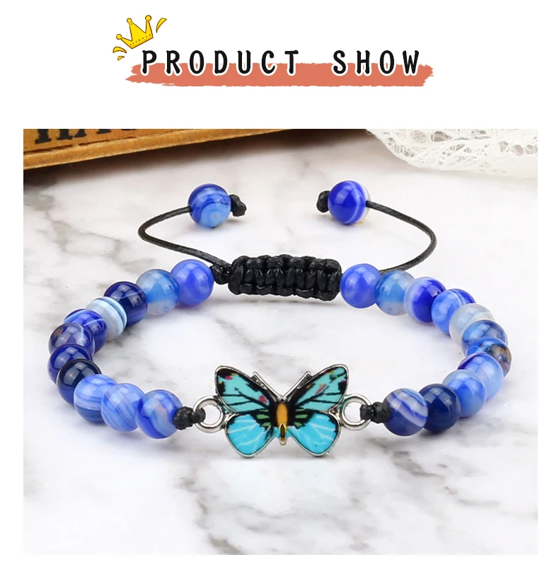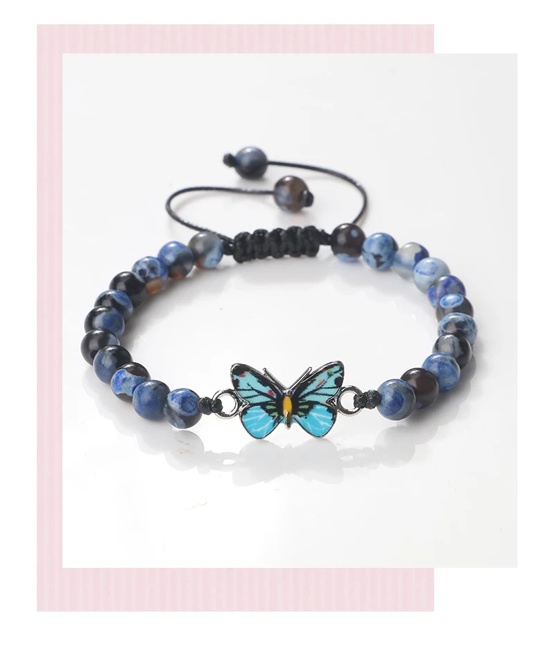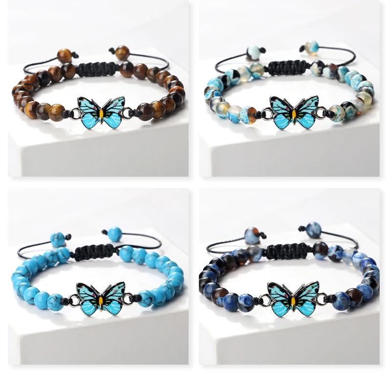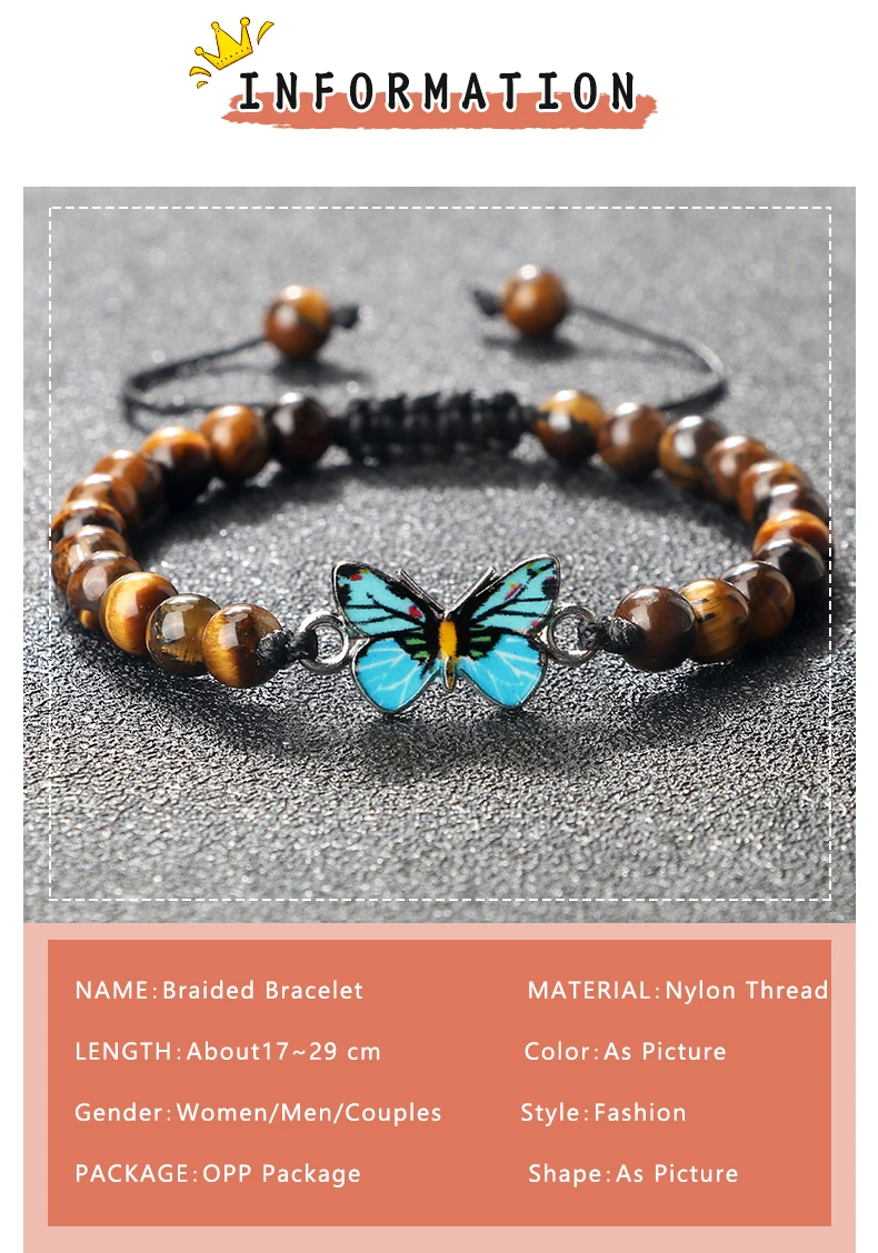 Blue Butterfly Fashion Bracelet Beaded Bangles Handmade 6mm Natural Tiger Eyes Stone Agates For Women Healing Adjustable Jewelry
