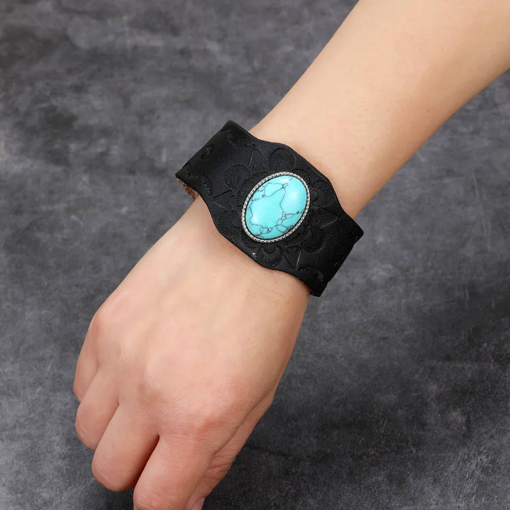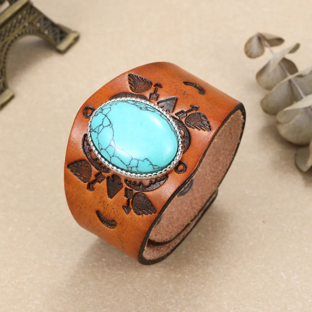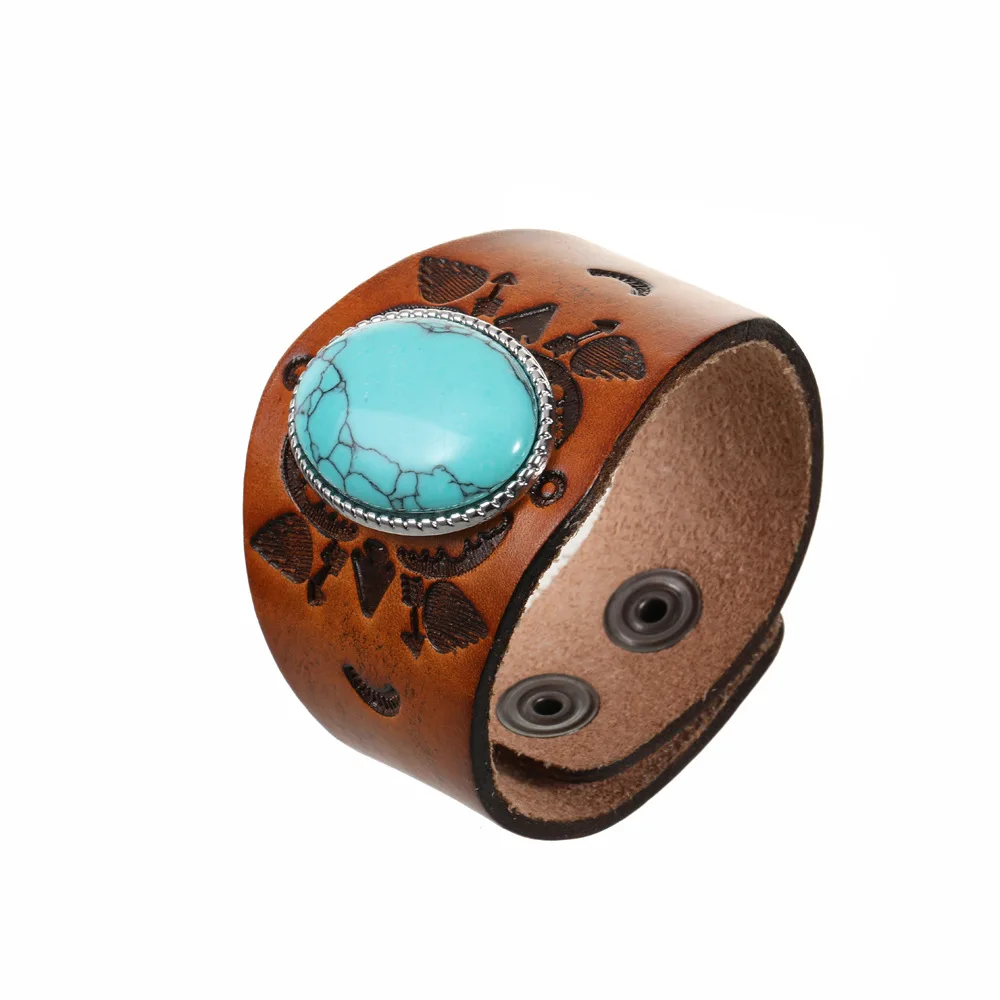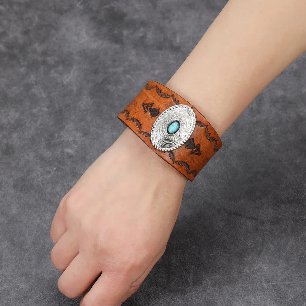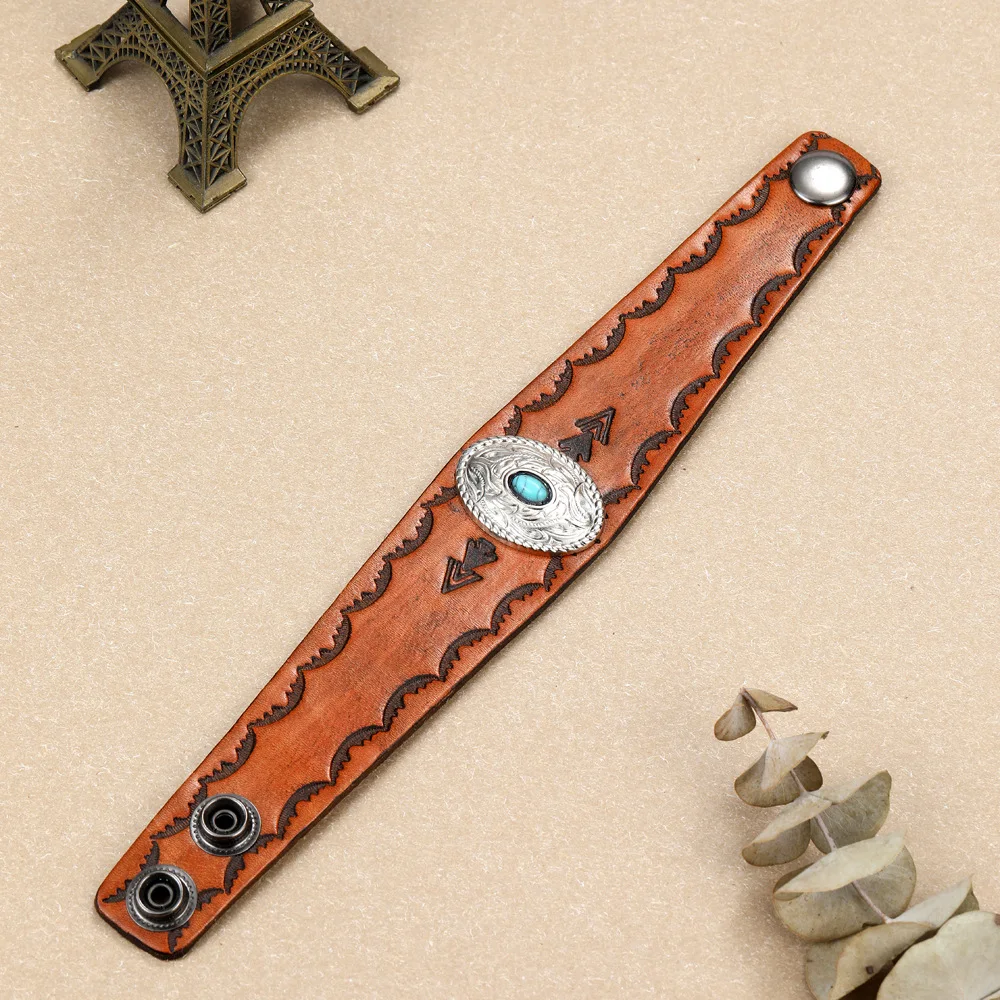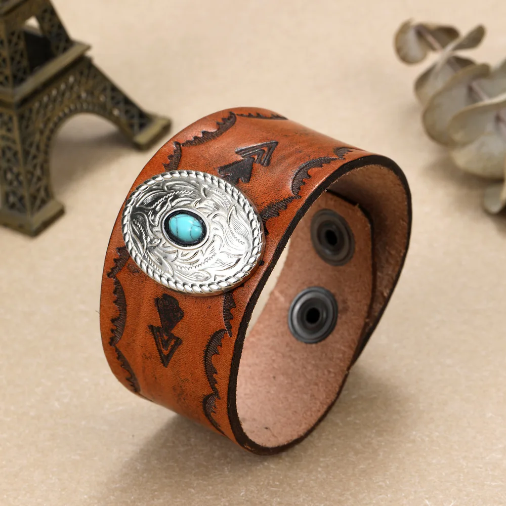 Medium Brown Tooled Leather Cuff/Wrist Bracelet with Concho Engraved Brown Turquoise Leather Bracelet Vintage Wristband